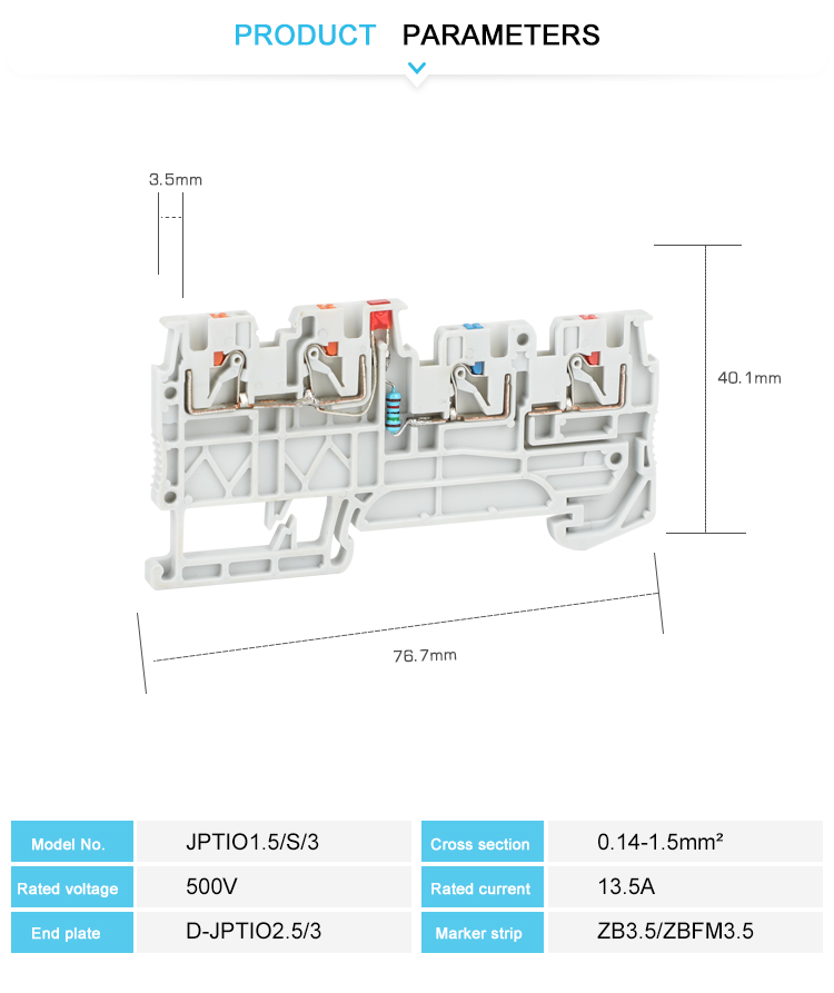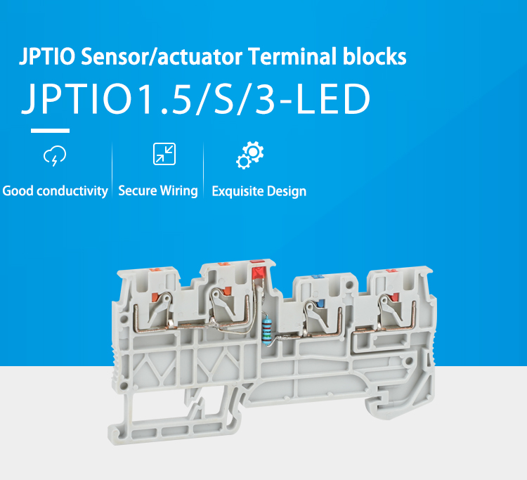 Μπλοκ ακροδεκτών JPTIO1.5/S/3-LED(24V) Το μπλοκ ακροδεκτών υιοθετεί επιβραδυντικό φλόγας νάιλον PA66, ορειχάλκινο αγωγό και ελατήριο συμπίεσης από ανοξείδωτο χάλυβα για να διασφαλίσει την ηλεκτρική ασφάλεια και τη μηχανική αντοχή κάτω από σκληρές συνθήκες εργασίας.