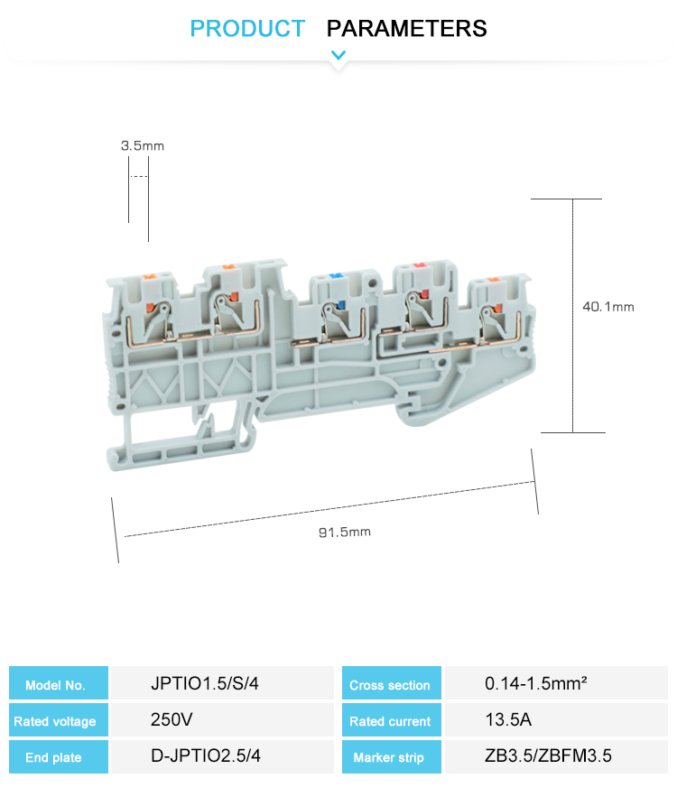 Αυτό το μπλοκ ακροδεκτών υποστηρίζει πολλαπλές συνδέσεις σύρματος σε μία μόνο μονάδα, προσφέροντας ευελιξία για σύνθετες διαμορφώσεις καλωδίωσης. Ο συμπαγής σχεδιασμός και η σύνδεση μπροστινής πρόσβασης απλοποιούν την εγκατάσταση σε περιορισμένους χώρους, ενώ το παγκόσμιο πόδι στήριξης εξασφαλίζει τη συμβατότητα με το DIN Rail NS 35. Το JPTIO1.5/S/4 διευκολύνει επίσης την κατανομή του ηλεκτρικού δυναμικού μέσω σταθερών γέφυρων στο τερματικό κέντρο. Ένα ευρύ φάσμα αξεσουάρ, συμπεριλαμβανομένων των τελικών καλύψεων, των τελικών πώματος, των λωρίδων δείκτη, των γέφυρων plug-in και των φορέων δεικτών, είναι διαθέσιμη για την ενίσχυση της λειτουργικότητας και τη βελτίωση της οργάνωσης.