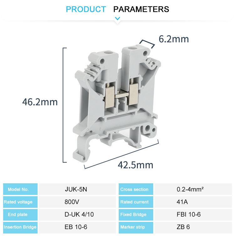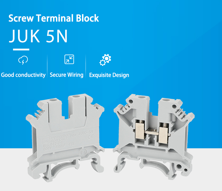 Το JUK "αποδεδειγμένο ασφαλές αξιόπιστο" βιδωτό σύστημα βιδών καλύπτει μέσω/προστατευτικών τερματικών γείωσης με διαμέτρους σύρματος που κυμαίνονται από 1,5 έως 240mm². Είναι κατάλληλο για συμπαγή/πολλαπλών κλώνων και είναι κατασκευασμένο από νάιλον από νάιλον από φλόγα PA66 από νάιλον + νικέλιο. Η χαμηλή αντίσταση επαφής εξασφαλίζει αξιόπιστη αγωγιμότητα. Υποστηρίζει σιδηροτροχιά 35mm για άμεση εγκατάσταση και χρήση. Ο παράγοντας καθολικής μορφής JUK 6N-10N είναι συμβατός με αξεσουάρ, όπως καλύμματα τελικών και διαχωριστικά. Εξοπλισμένο με ένα πλήρες οικοσύστημα αξεσουάρ που περιλαμβάνει γεφύρωση γεφυρών, απλοποιεί τις απαιτήσεις ταχείας εγκατάστασης και προσαρμογής σε σενάρια όπως η βιομηχανική κατανομή ισχύος και τα ντουλάπια ελέγχου.