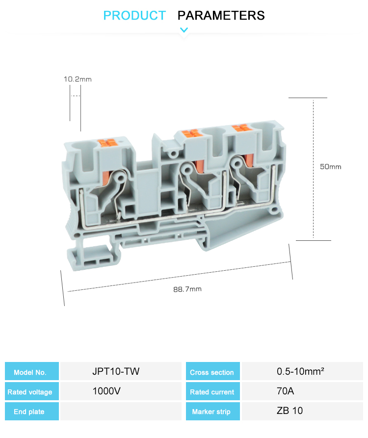 Η σειρά PT10-TW UT Push-in βιδωτή βίδα Multi-Conductor Terminal Block επαναπροσδιορίζει την ηλεκτρική σύνδεση. Η δομή ώθησης χωρίς βίδα επιτρέπει τη γρήγορη εισαγωγή και την ταυτόχρονη σύνδεση πολλαπλών αγωγών, απλοποιώντας το χρόνο εγκατάστασης καλωδίωσης και συντομεύσεως. Τα υλικά υψηλής ποιότητας είναι ανθεκτικά στις κραδασμούς και τη μηχανική τάση, σταθερά και αξιόπιστα. Ο συμπαγής σχεδιασμός είναι κατάλληλος για σενάρια περιορισμένου χώρου και ισχύει για τα βιομηχανικά μηχανήματα, τα ντουλάπια ελέγχου και τον ηλεκτρονικό εξοπλισμό, παρέχοντας μια αποτελεσματική και βολική λύση σύνδεσης για το ηλεκτρικό πεδίο.